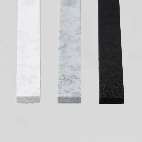 Quando utiliza uma tira de acabamento, é necessária uma faixa de junção do material de feltro RecoSilent. A faixa de junção ajuda a montar facilmente a tira de acabamento no painel de ardósia final e a obter um bom acabamento na parede de ripas. A faixa de junção preenche o espaço criado quando se utiliza uma tira de acabamento ao longo da lateral do painel que termina com uma ripa de madeira.